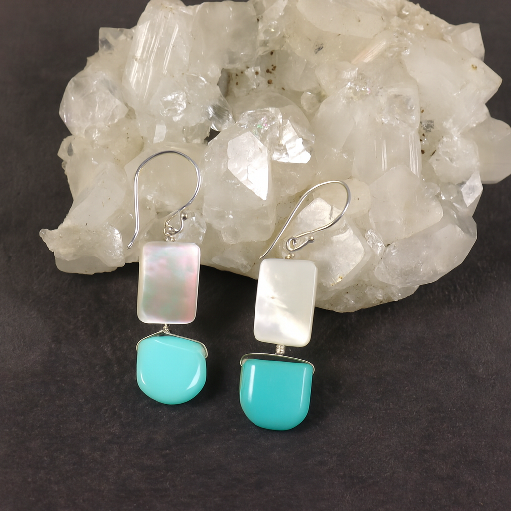 Shimmering with oceanic mystique and golden warmth, these handcrafted earrings pair ethereal Mother of Pearl rectangle beads with vibrant Blue Peruvian Opals. Finished in Gold Vermeil or Sterling Silver — refined, radiant, timeless.