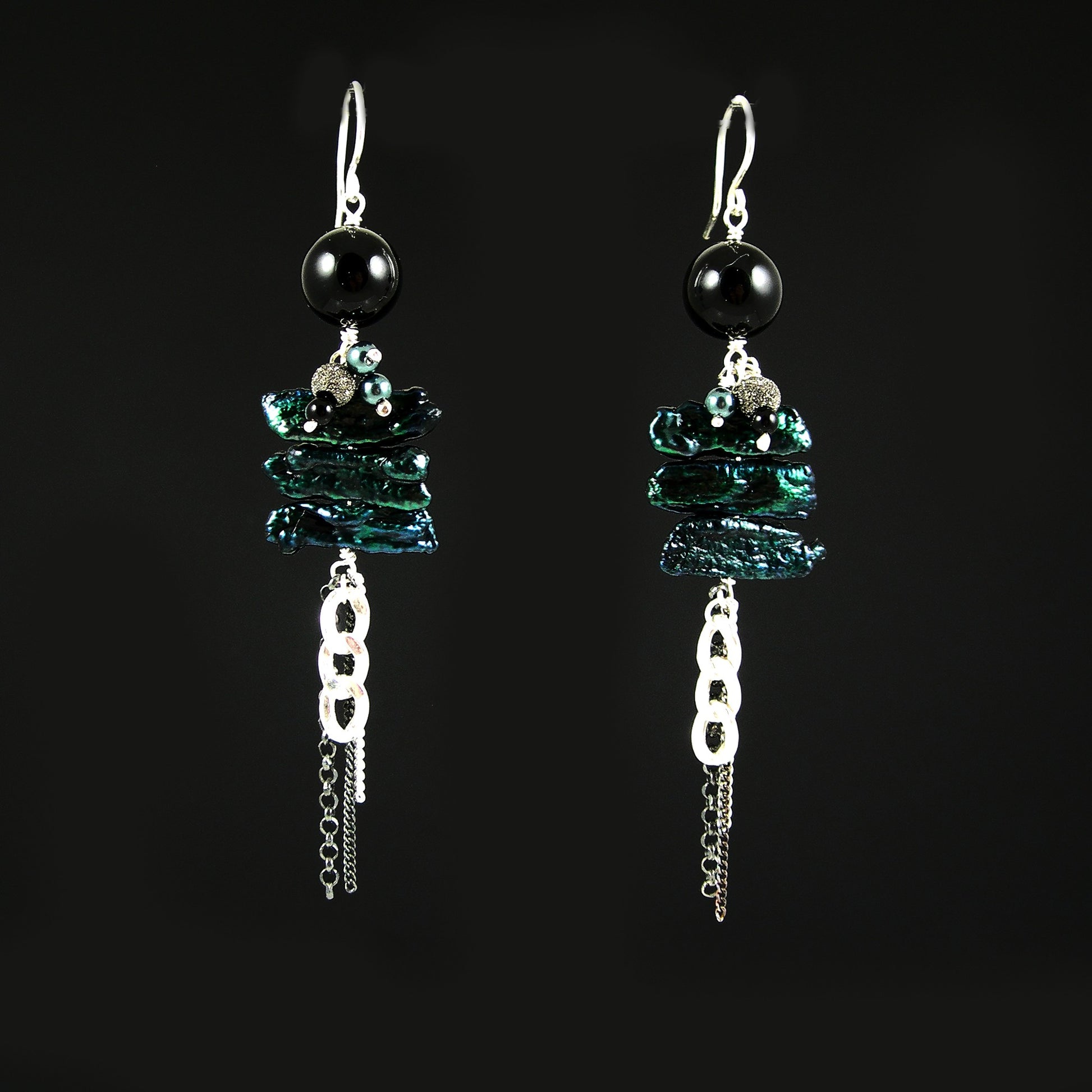 Elevate your jewellery collection with these handcrafted freshwater pearl and black onyx dangle earrings. Featuring black onyx stones, lustrous blue green pearls, and cascading silver chains, each pair is designed to evoke oceanic mystique and timeless elegance.