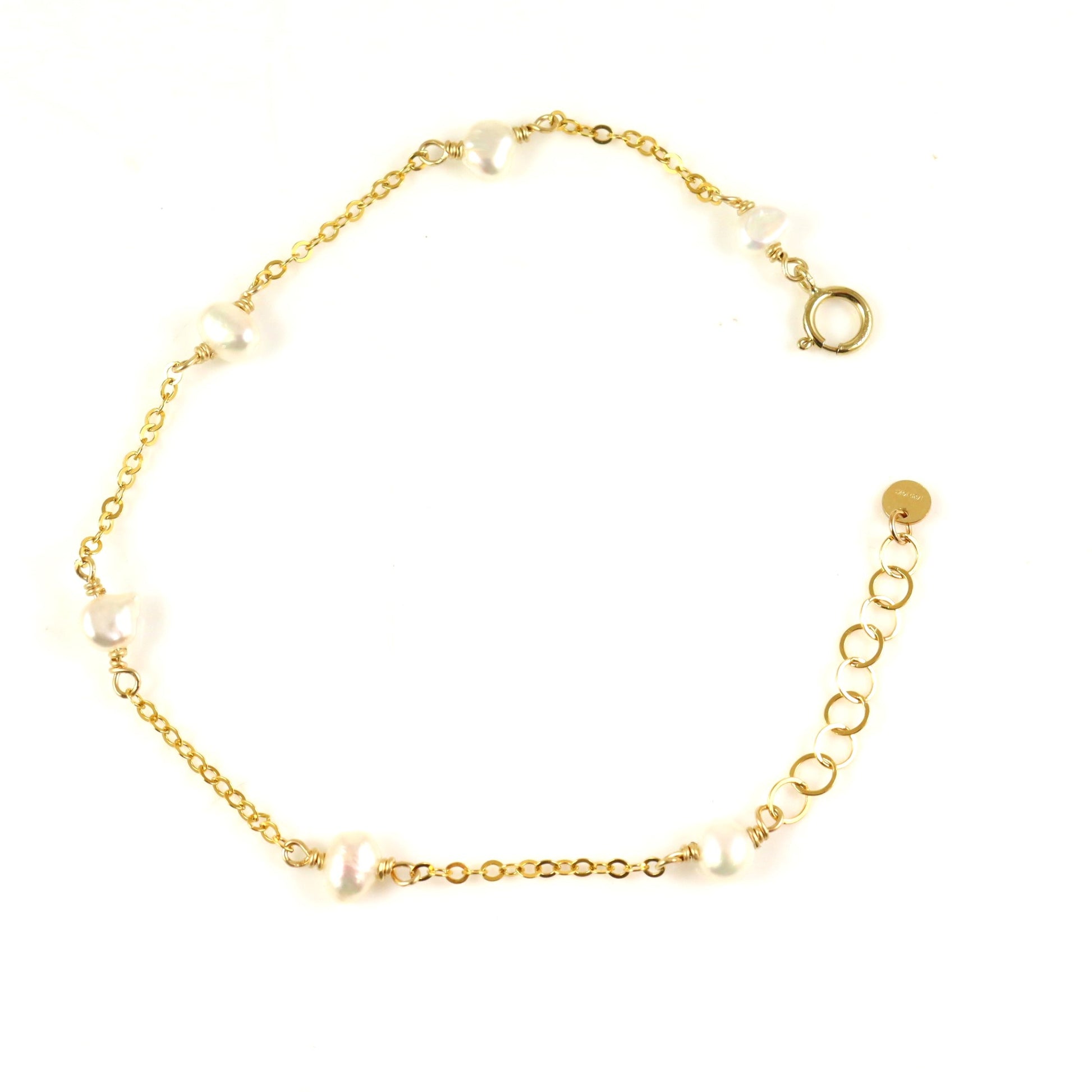 This gold-filled chain bracelet adorned with white cream freshwater pearls offers a sophisticated touch to any ensemble, making it ideal for brides or bridesmaids. Its timeless design also complements layering with other delicate gemstone bracelets or minimalist bangles.